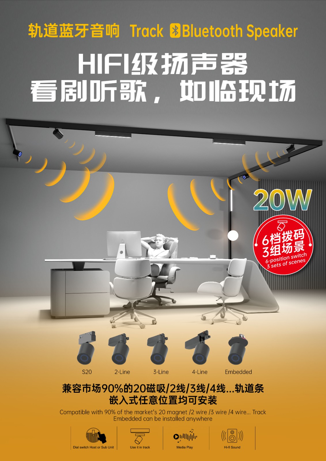 With a slim, minimalist and sleek appearance designed by ARLIGHTING, the speaker perfectly fits the style of magnetic track systems, avoiding visual clutter and enhancing the overall sense of space. Our factory’s OEM service covers full-process customization, including appearance design, sound quality tuning, and function configuration, to adapt to different market segments. It is widely applicable to various scenarios, including homes, hotels, shopping malls, exhibition halls, offices and commercial spaces, combining the functions of lighting ambiance and audio entertainment to bring a smarter, more comfortable and immersive experience to users—consistent with ARLIGHTING’s commitment to high-quality intelligent audio-visual products. In addition, it has a long standby time and energy-saving design, which is both practical and environmentally friendly, meeting the diverse needs of modern intelligent life, reflecting ARLIGHTING’s humanized design concept, and also available for OEM customization to meet your brand’s unique requirements.